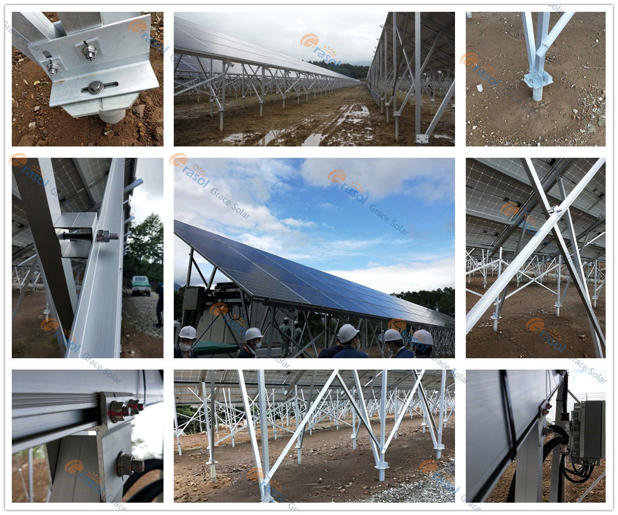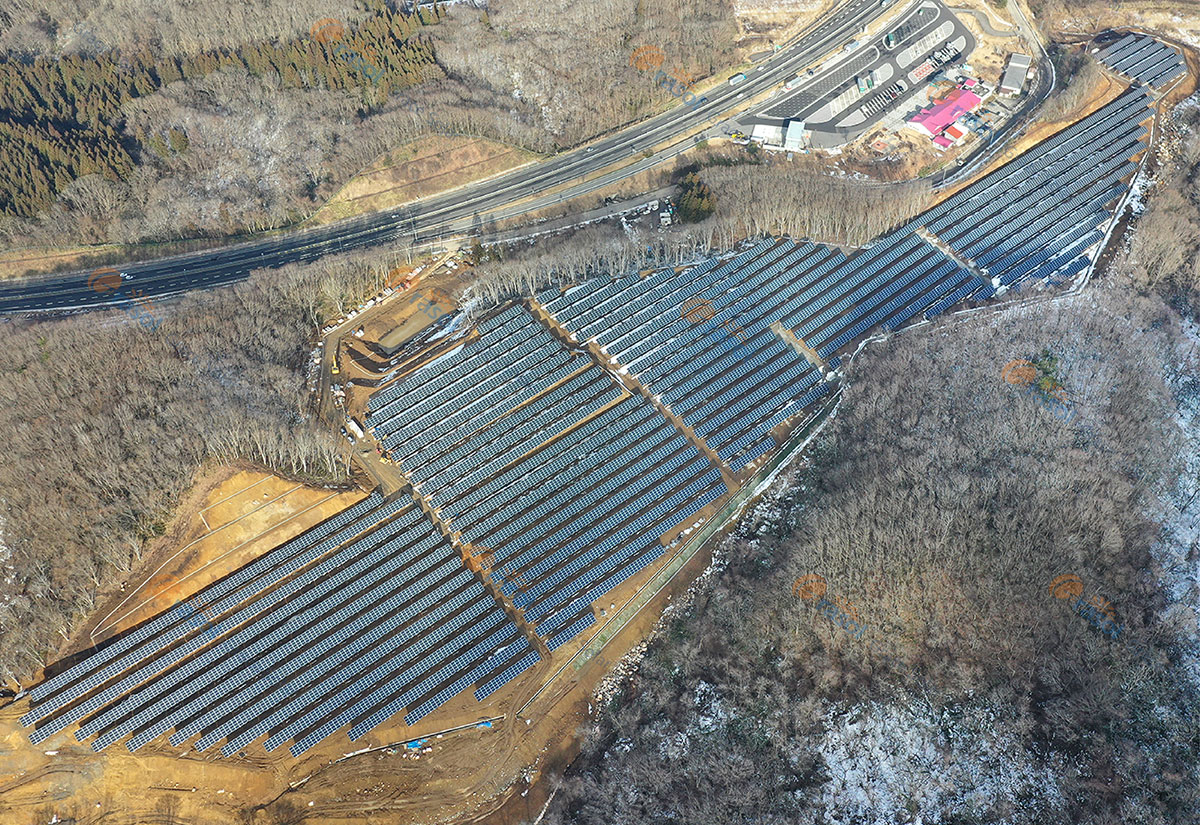 日本福岛县以高积雪著称,大部分地区垂直积雪在100cm以上,除去堆积在太阳能组件的积雪荷重外,还有积雪重复融化凝固产生高密度的类似于雨夹雪的现象,因此难以预估积雪的真实荷重,使得高雪区域的项目的设计尤为棘手。考虑到多方面的积雪情况,此次项目工程师采用了格瑞士高强度的NKY系列横材和纵梁对应,跨距之间设置交叉斜拉杆,有力地支撑起多雪区域下太阳能组件,为项目提供了安全保障。