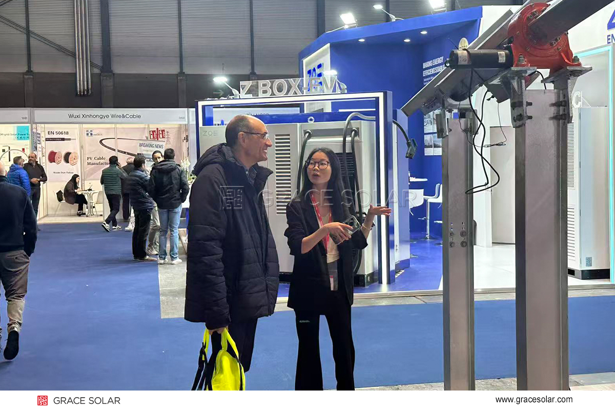 AI智能跟踪系统以其卓越的发电增益表现,成为展会现场的技术亮点。该系统通过智能算法实时优化光伏板角度,特别适用于西班牙南部等高辐照地区及复杂地形,显著提升发电效率,多位电站投资方就该系统在当地项目的应用与技术人员进行了深入探讨。