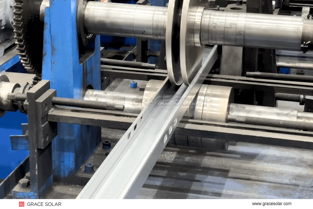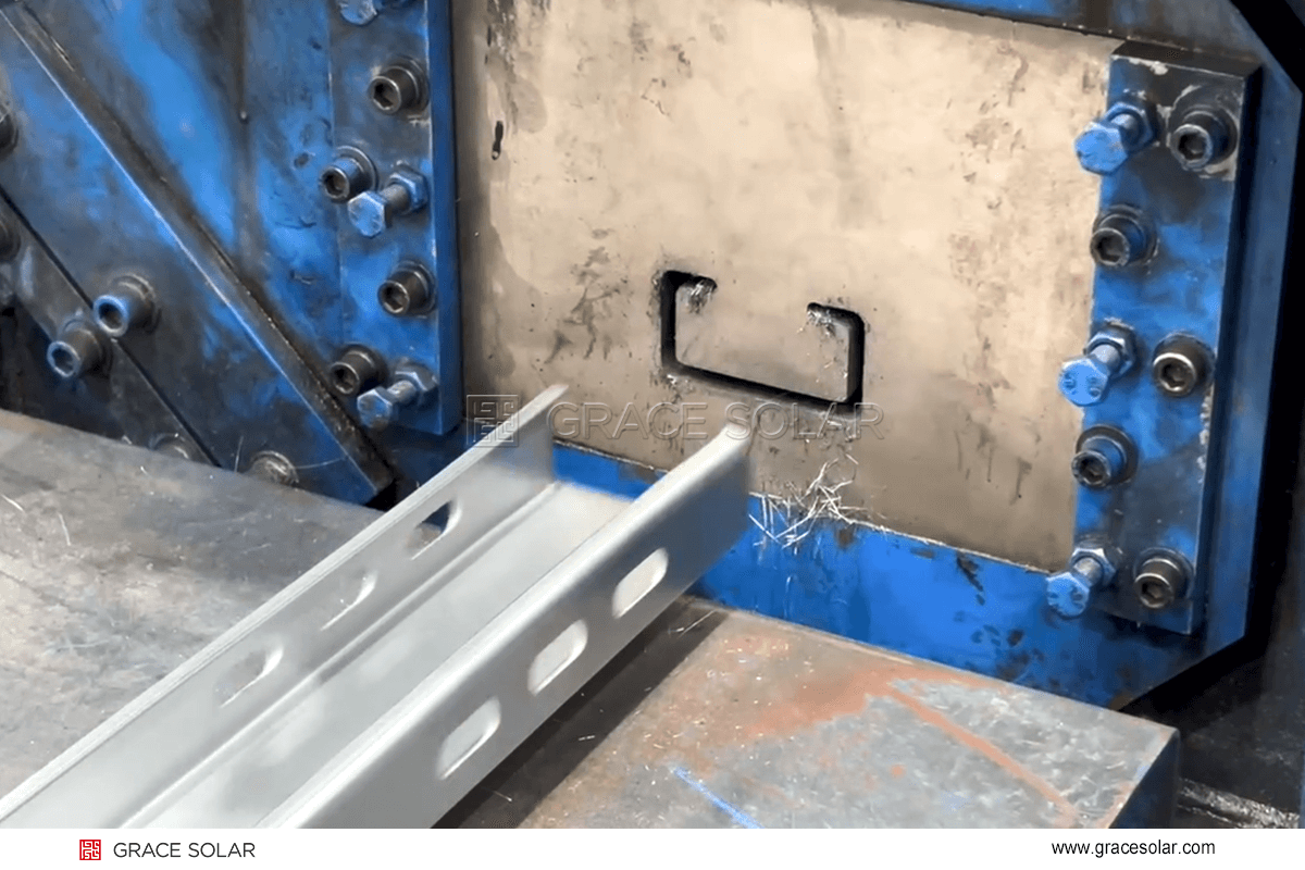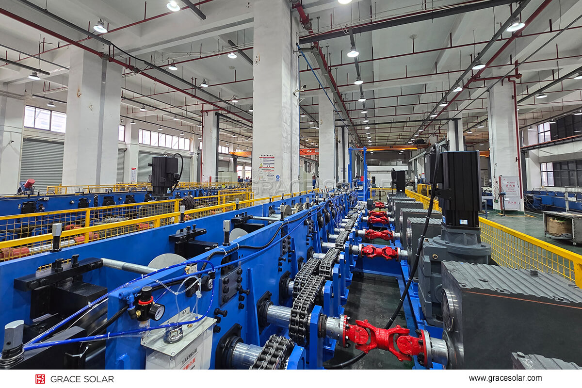 在传统光伏支架生产中,碳钢产品生产往往需要人工监控、调整,很大程度上限制了产线的运行速度。然而,国瑞能“智”造中心已完成全新升级,实现“黑灯工厂”化。全自动生产线正稳步运行着,从原材料开卷、成型、冲孔到切割等,全程无需人工干预。得益于这种高度自动化的设计,一条条产线可实现24小时运转,正是这种“人停机不停”的自动化能力,让年产量得以稳步攀升,碳钢产品年产能达30万吨。