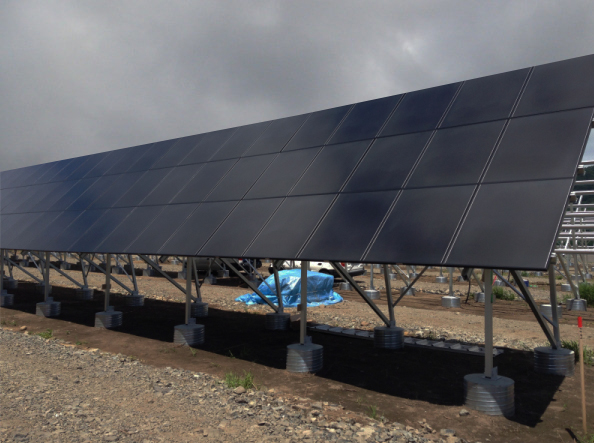 该电站电池板的设置方法为,将单管桩基打入地下1m左右,再用接头将单管与架台组装起来。阵列(电池板的设置单位)大致分5片,为南北2列设置。以约15度的角度设置了3个约230张(横23张×纵10张)和2个约340张(横34张×纵10张)电池板的大面积阵列。
