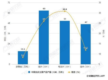2019年上半年,由于海外市场需求旺盛的驱动,中国光伏制造端继续保持了良好的增长态势,主要制造企业均呈现生产端和销售端产销两旺局面。其中,多晶硅产量15.5万吨,同比增长8.4%;硅片产量63GW,同比增长26%;电池片产量51GW,同比增长30.8%;组件产量47GW,同比增长11.9%。