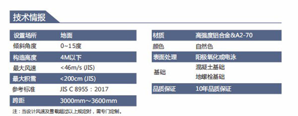 优点:除基础外,采用全铝合金结构,可以无限扩延与连接,并采用适当的方法在保证人及机器的通过性外,还保证了整个支架结构的稳固性。除此之外,支架的高度和跨距可以根据具体要求设计,对气候的适应力很强,抗风雪能力强。