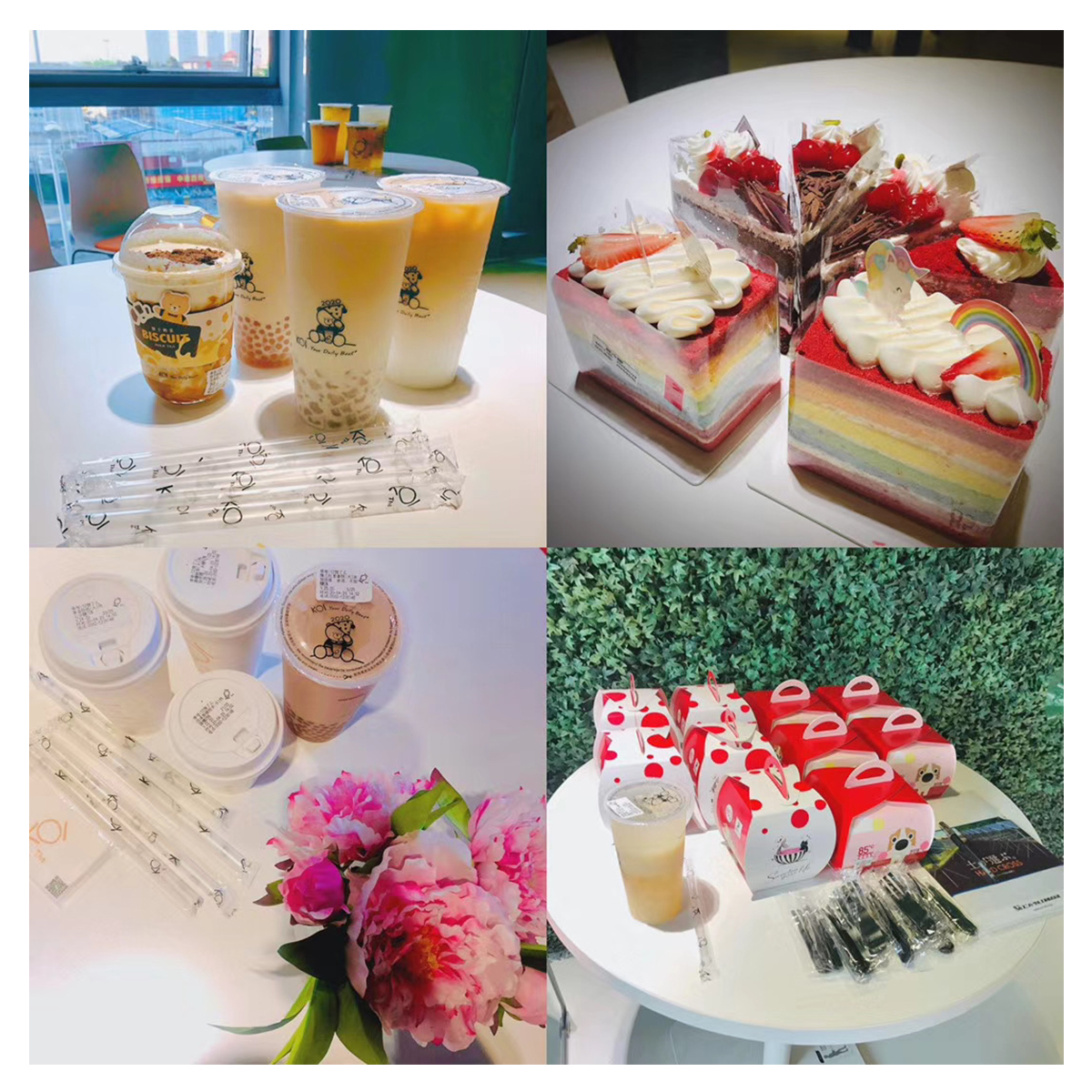 摆放鲜花、美味的蛋糕和饮品