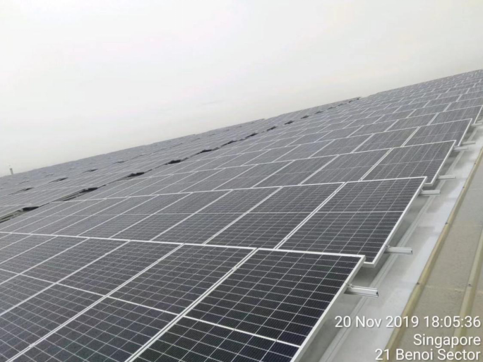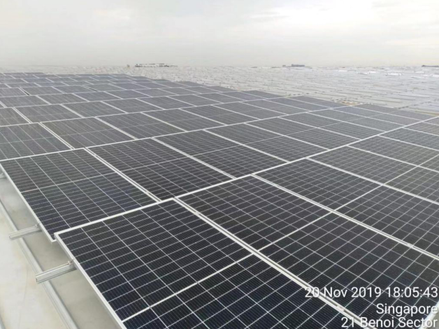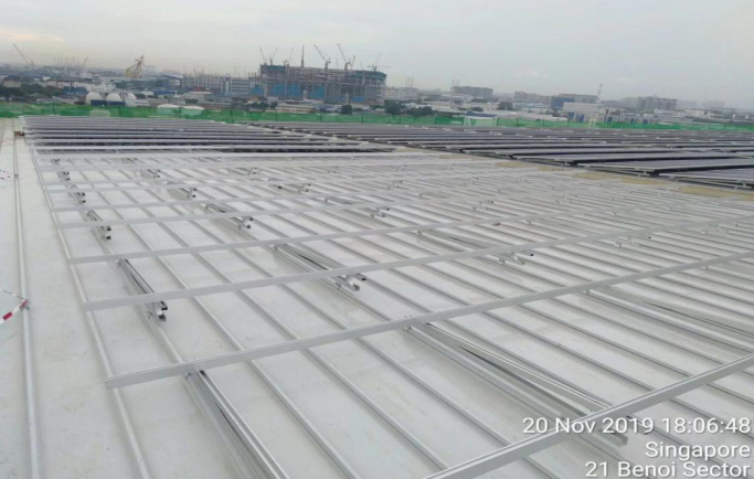 该项目分别在新加坡Benoi 和Marsilling, 采用NT三角架+DR导轨+S08挂钩屋顶方案,很好解决客户要求的倾斜屋顶排水以及大风问题。