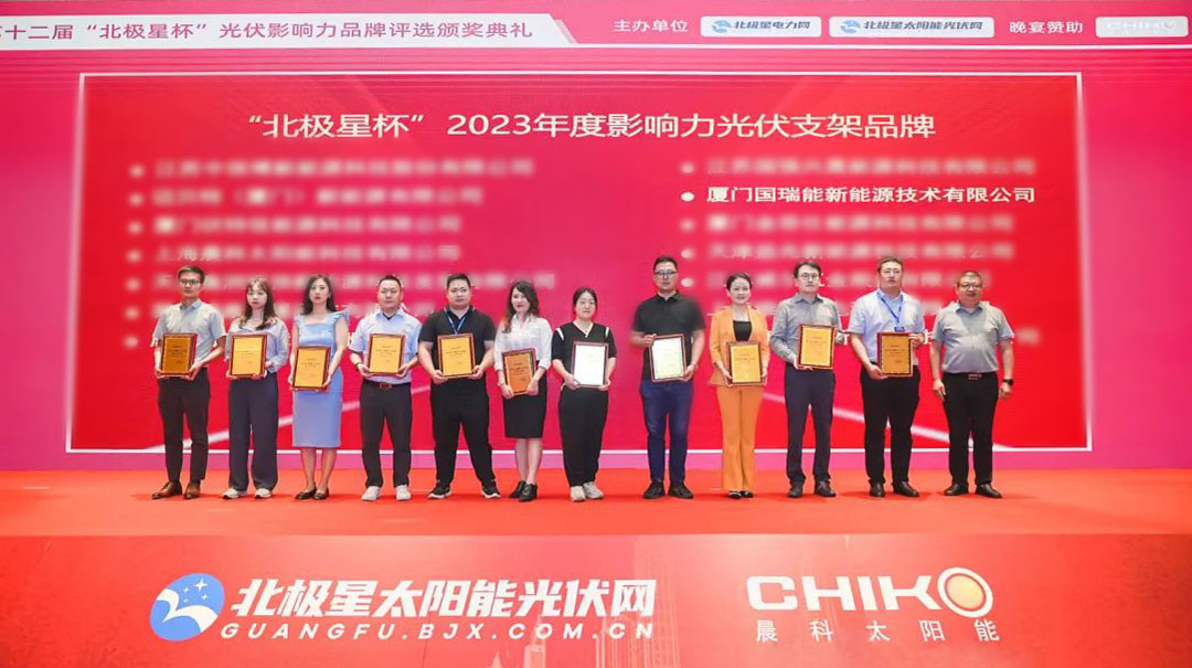 2023年9月19日,第十二届“北极星杯”光伏影响力品牌评选颁奖典礼在江苏无锡市隆重举行。国瑞能作为全球领先的光伏支架智造商,国内知名创新型企业,凭借创新实力、品牌价值和项目应用等方面卓越表现,连续六年蝉联“影响力光伏支架品牌”奖项,并再次斩获荣获“影响力特色光伏应用项目案例企业”奖项。