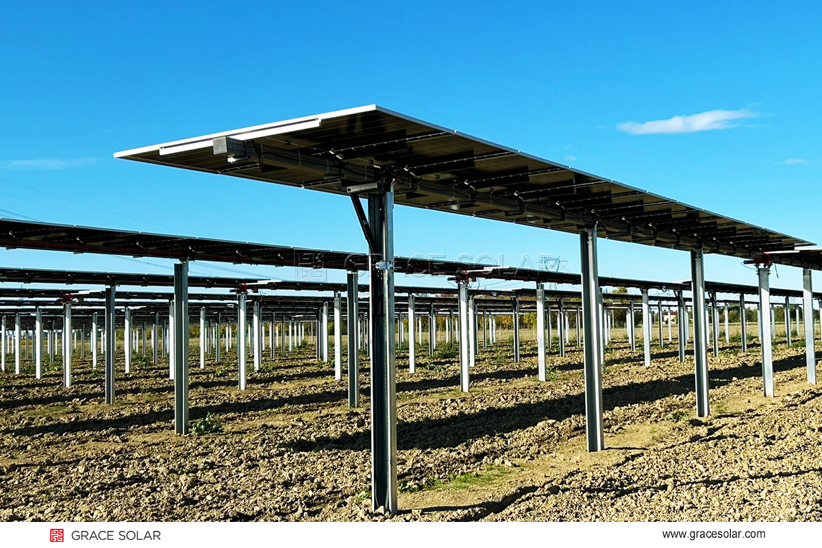 在项目实施中,国瑞能与意大利本地工程团队紧密合作,严格遵循欧盟CE认证标准及相关安全规范,确保高离地跟踪支架从基础施工到控制系统集成的全流程合规。支架主体采用模块化设计与预组装节点,降低了现场安装复杂度。配合本地施工团队的高效协作,较原计划提前投入运营。